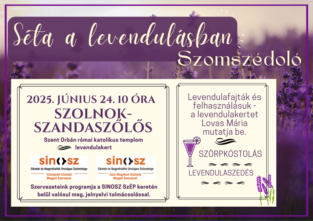 Sétálj velünk a szolnok-szandaszőlősi Szent Orbán római katolikus templom levendulakertjében! Programunkban lesz levendulaszedés, levendulaszörp-kóstolás, és sok hasznos információt is megtudhatunk a gyógy-, fűszer- és dísznövényről. További információk, jelnyelven is: LEVENDULA